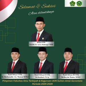 Momentum penting ini juga menandai pengukuhan kepemimpinan baru di Fakultas Ilmu Tarbiyah dan Keguruan (FITK). Dalam proses tersebut, Prof. H. Arten Mobonggi, M.Pd. resmi dilantik sebagai Dekan FITK untuk periode 2025–2029. Kepemimpinan beliau diperkuat oleh Tim Kepemimpinan Akademik Fakultas, yakni: